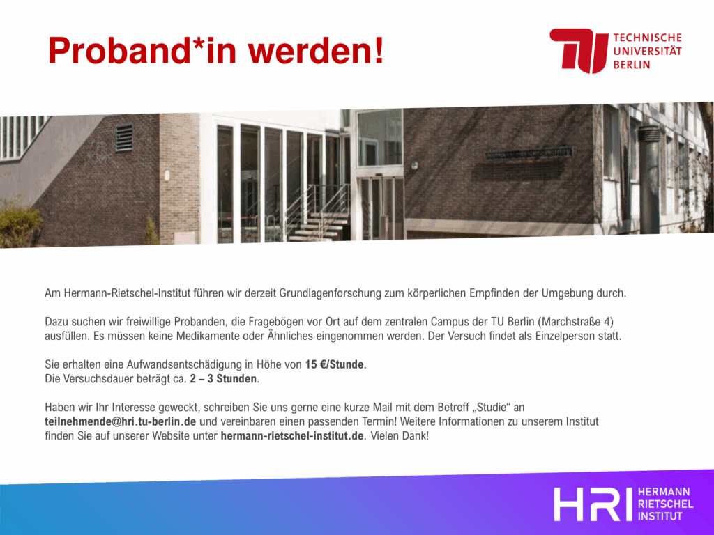 Haben wir Ihr Interesse geweckt, schreiben Sie uns gerne eine kurze Mail mit dem Betreff „Studie“ an teilnehmende@hri.tu-berlin.de und vereinbaren einen passenden Termin! Weitere Informationen zu unserem Institut finden Sie auf unserer Website unter hermann-rietschel-institut.de. Vielen Dank!